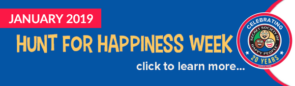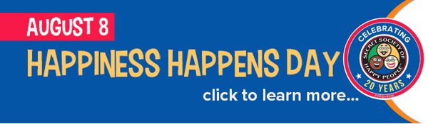 To celebrate our first birthday the Society declared August 8, Admit You’re Happy Day that we later changed to Happiness Happens Day. The following year we expanded the celebration to include the whole month of August — because some people informed me that they might not be able to celebrate on August 8 so now they had 30 other days to be happy. We eventually added Hunt for Happiness Week.