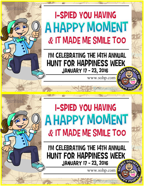 BONUS ACTIVITY: Play Happy I-Spy. When you see someone having a happy moment (it can be friend, family or stranger) either hand them a Happy I-Spy Certificate that you printed or send via text, email or post on their social media page the electronic version or tweet the twitter version.